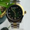 Classic Two-Tone Day-Date Style Watch This striking timepiece features the iconic President style design, blending silver-tone stainless steel with polished gold-tone accents on the bracelet and bezel. The gold-tone dial is elegantly appointed with crystal-look hour markers and includes the useful Day-Date function displayed prominently at the 12 and 3 o’clock positions. A bold and sophisticated statement piece for formal or everyday wear.